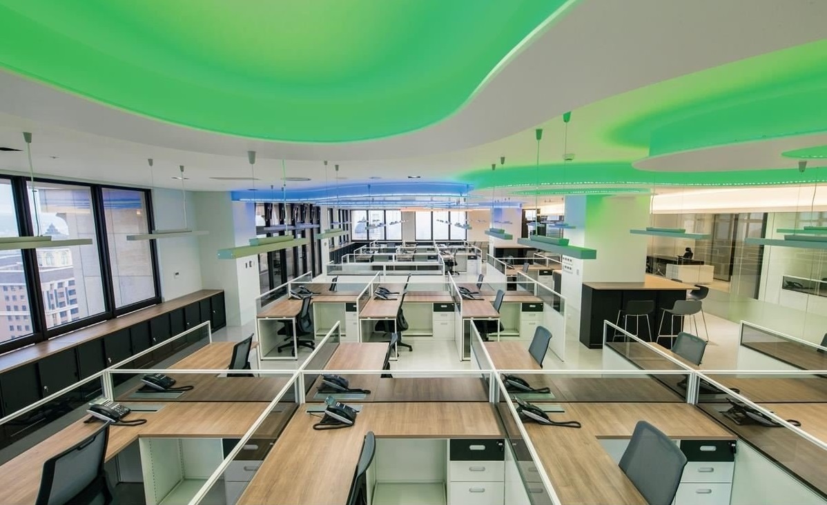 ▲空間融入圓弧流線、多彩燈光,帶出布料柔軟具層次的意象,員工座位則比鄰而坐,整齊劃一、層次明確,并規(guī)劃高度 100 cm 的座位隔屏, 維持流通的空間視線。