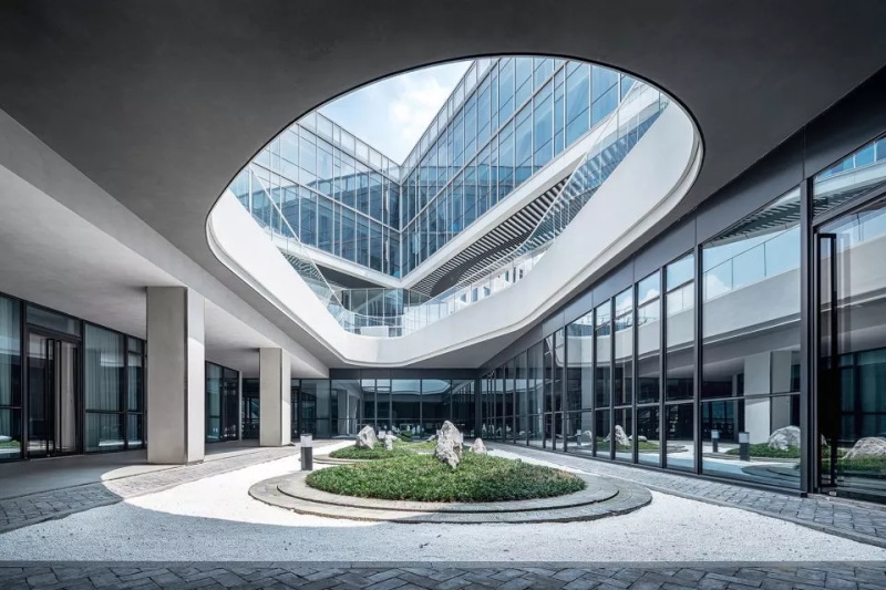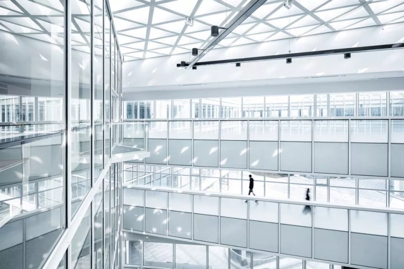 中庭通高空間三個(gè)界面使用透明玻璃,每層間隔著懸挑三角形露臺(tái),員工可以在工作之余小步走到露臺(tái)上休憩。結(jié)合位于中庭兩側(cè)的綠色樹木和花草,陽(yáng)光從頂部三角形網(wǎng)格采光頂照下來(lái),創(chuàng)造了中庭里仿佛置身于充滿活力的室外庭院的體驗(yàn)。這些原本在室外的元素被引入室內(nèi),模糊了室內(nèi)外的邊界,室內(nèi)設(shè)計(jì)也結(jié)合在了整體的建筑之美中。