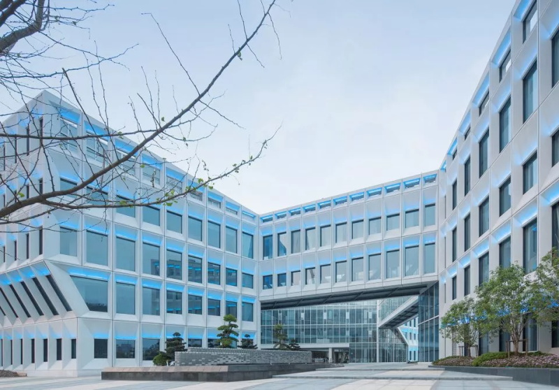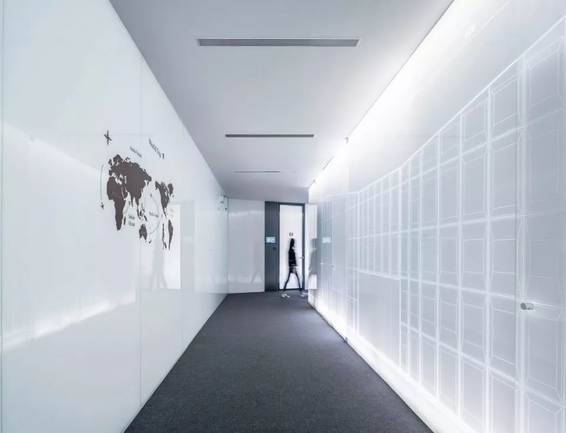 辦公室公共走道的空間基調(diào)較之為開敞明亮,以白色為主基調(diào),一側(cè)為白色烤漆玻璃,另一側(cè)將外立面圖刻印在烤漆玻璃面上、內(nèi)部打光后立面線條清晰的展現(xiàn)出來(lái),塑造了富有未來(lái)感的空間。