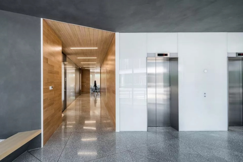 公共走道的區(qū)域,用以現(xiàn)代感強(qiáng)的深灰色作為主色調(diào),而在會(huì)議室相對(duì)私密的走道用木質(zhì)材質(zhì)為主,形成了空間的包裹感受,對(duì)不同區(qū)域空間進(jìn)行了區(qū)分。