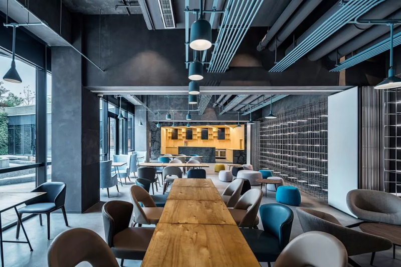 餐廳的設(shè)計(jì)將企業(yè)發(fā)祥地的吳越文化融入設(shè)計(jì)語(yǔ)言,材料上使用自然質(zhì)感、還原員工在工作中經(jīng)常接觸的材料,體現(xiàn)企業(yè)建造文化。通過(guò)抽取民居屋頂天際線,以兩種不同的顏色木飾面,拼貼出一幅抽象的江南水鄉(xiāng)天際線貫穿墻面,行徑其中可以感受到抽象畫面背后的文化韻味。為了保證空間的高度和使用的靈活性,就餐部分采用裸頂?shù)淖龇?,在一?cè)休息區(qū)設(shè)置吊頂解決管線等問(wèn)題。