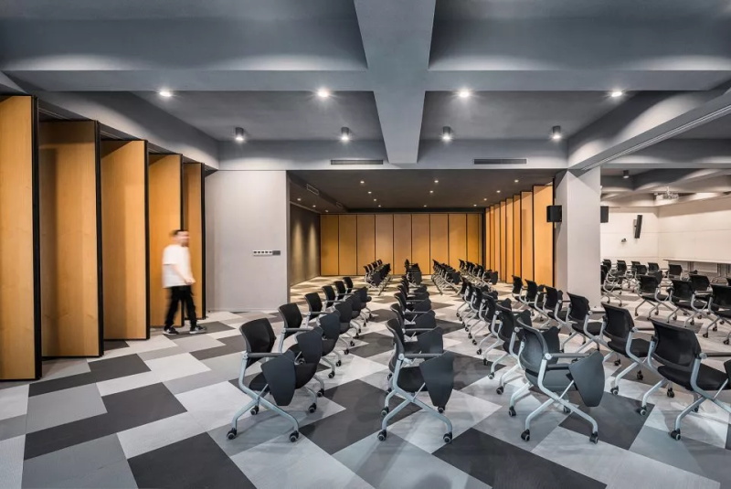 多功能廳基于建筑的大空間,一面墻設(shè)置為白色烤漆玻璃和投影面,另外三個(gè)面和中央通過(guò)可旋轉(zhuǎn)和平移的隔斷設(shè)置,可以根據(jù)使用行為劃分出不同的空間狀態(tài):隔斷全都打開的時(shí)候是開敞的無(wú)柱大空間,方便全體員工的活動(dòng)和會(huì)議;隔斷全都關(guān)閉的時(shí)候空間被分為四個(gè)可以獨(dú)立使用的小空間,進(jìn)行培訓(xùn)、討論等活動(dòng)。