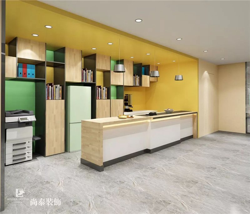 員工們?cè)谛燎诠ぷ髦噙€需解壓,以亮黃色為主色調(diào)茶水間內(nèi)配備了吧臺(tái),餐椅和陳列柜,除了就餐,人們還可以在這里進(jìn)行書籍閱讀,該區(qū)域的設(shè)計(jì)活潑又有朝氣!